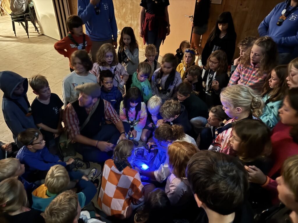 Maar dan…. In de nacht maakt de professor en Assi ons wakker met heel slecht nieuws, hij wilde nog even kijken naar alle hints die we tot nu toe hebben verzameld en zag opeens dat ons hele bewijsmaterialenbord leeg is geroofd! Dat moet wel door S.T.O.M. zijn gedaan. We kleden ons zo snel mogelijk aan, dit gaat bij de een wat sneller dan bij de ander. We verzamelen samen met de ander in de binnenruimte van het clubhuis en luisteren naar de professor. Hij heeft een idee waar S.T.O.M. misschien uit zou kunnen hangen, maar we moeten heeeel stil zijn. Ook is het handig om een zaklamp mee te nemen, want het is al laat. Ook de professor heeft een zaklamp, maar deze lijkt alleen een vaag paars licht af te geven.